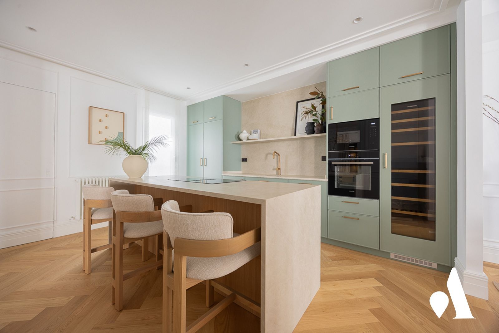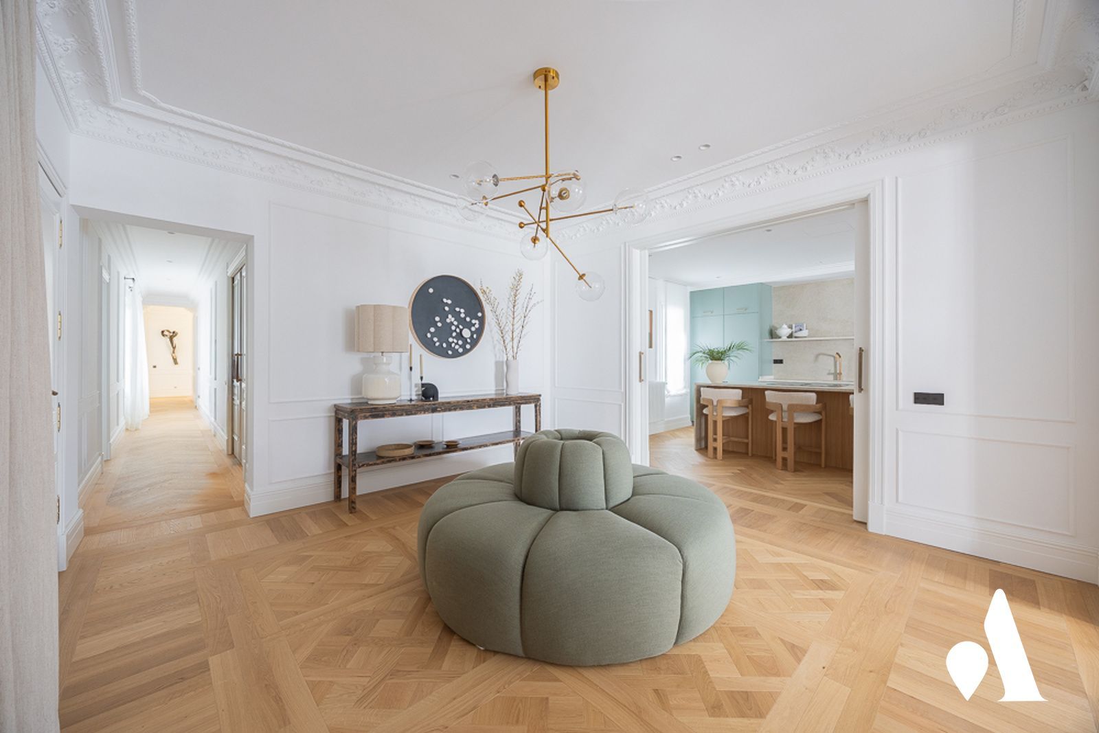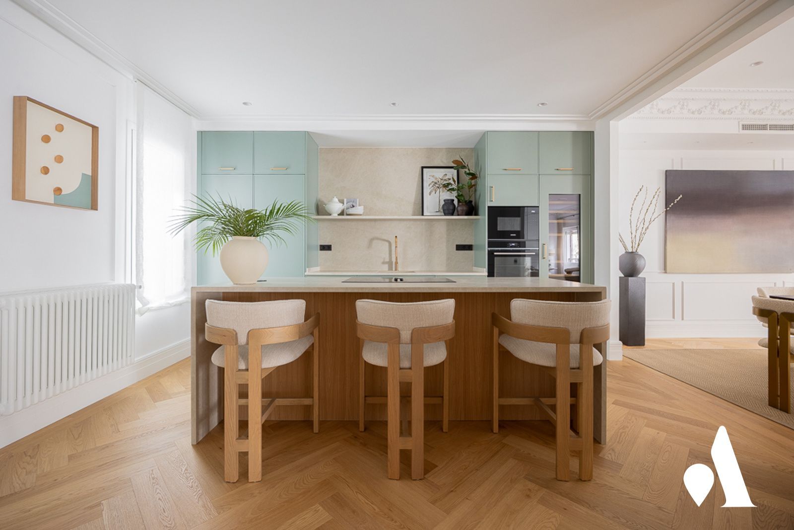 La cocina, completamente amueblada, ofrece un entorno práctico y agradable. Asimismo, el salón presenta una distribución óptima, y se conecta con una terraza de 12 m².