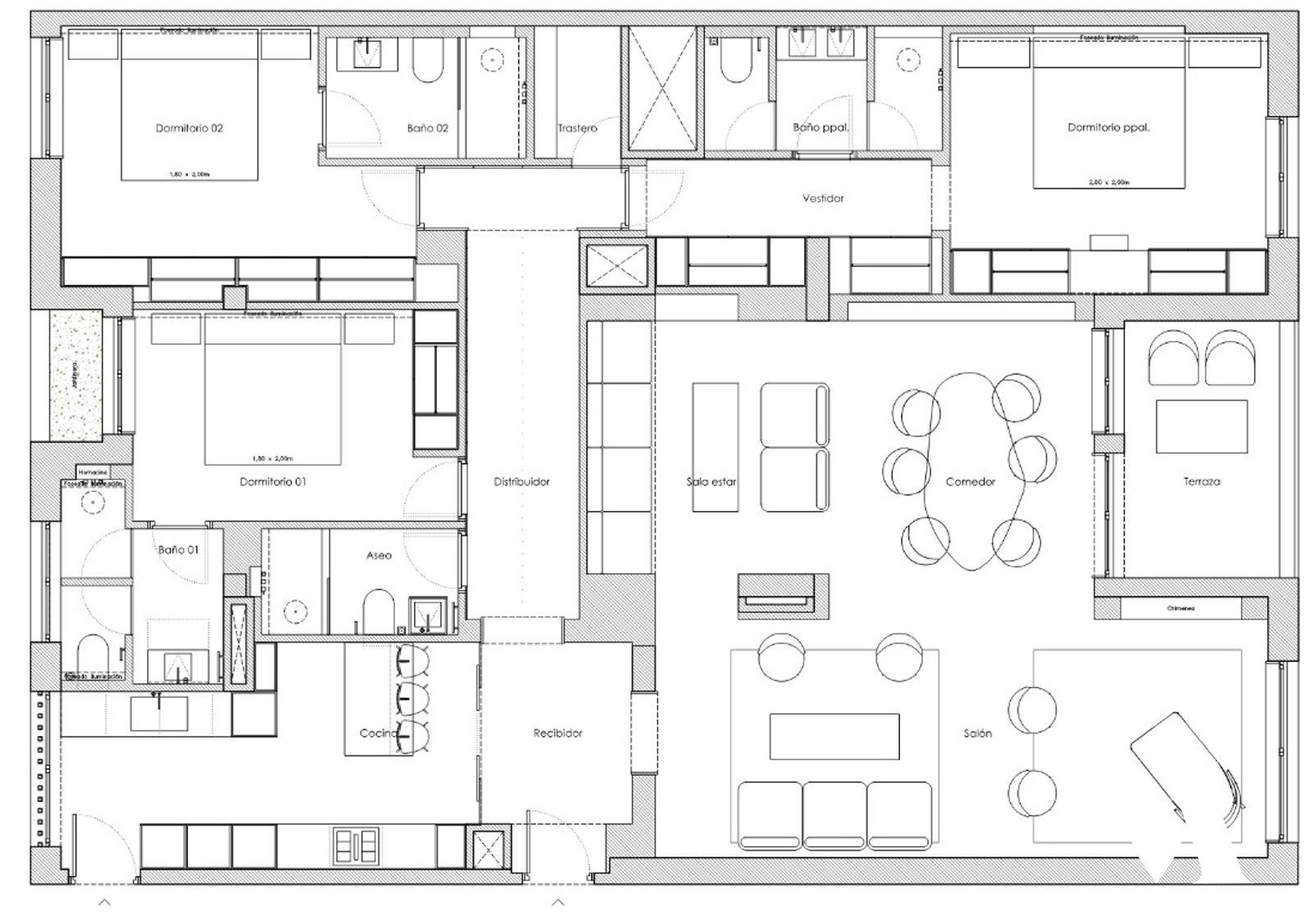 La distribución permite configurar entre 3 y 4 dormitorios, acompañados de 4 baños, optimizando la habitabilidad para diferentes escenarios familiares o profesionales. Su interacción entre espacios abiertos y privados facilita un uso flexible, adaptable a oficinas de alto rendimiento o a una vivienda con zonas de estar amplias y bien definidas. La terraza, luminosa y generosa.