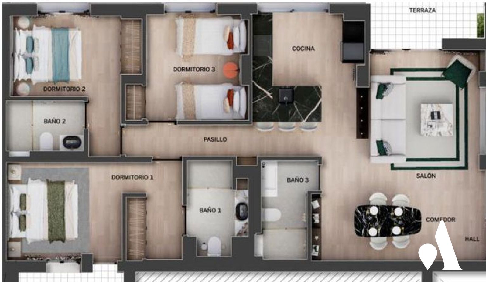La vivienda dispone de tres habitaciones, tres baños, garaje, ascensor y trastero, configurando una solución completa para familias o inversores que buscan comodidades a la vista de la ciudad. La climatización se garantiza mediante calefacción central y aire acondicionado, permitiendo confort durante todo el año.