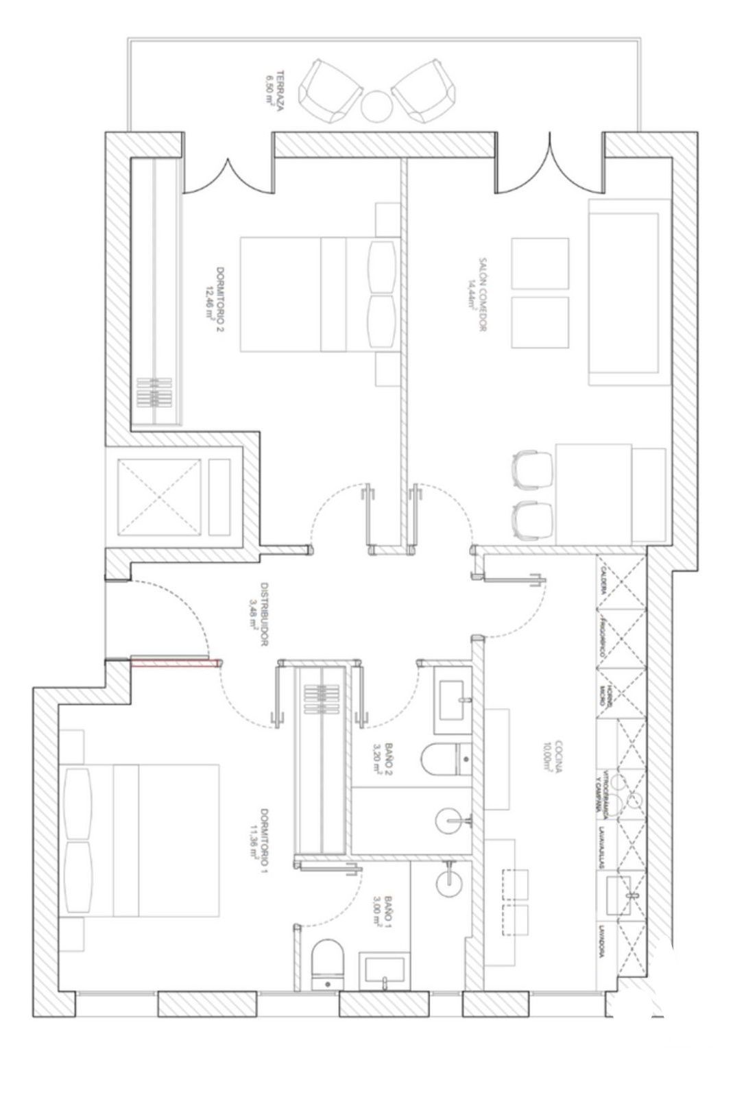 La superficie construida es de 77,00 m2 con una terraza de 6,50 m2. El inmueble dispone de dos habitaciones y dos baños completos, lo que facilita la organización de la vida diaria y ofrece la posibilidad de destinar una de las habitaciones a estudio o habitación de invitados. La calefacción es individual, lo que permite ajustar la temperatura de forma precisa y eficiente, y el sistema de aire acondicionado garantiza un confort óptimo en todas las estaciones.