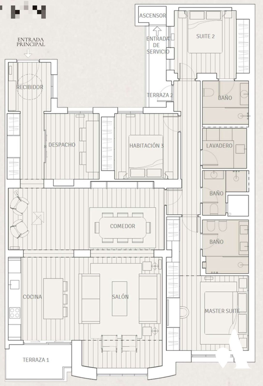Este inmueble dispone de tres habitaciones y una estancia destinada a despacho, lo que favorece la versatilidad para familias o formatos de trabajo desde casa. Dos de las habitaciones se presentan en configuración en suite. En total son tres baños completos que cubren las diferentes necesidades diarias, además de un lavadero separado que aporta comodidad para las labores domésticas.