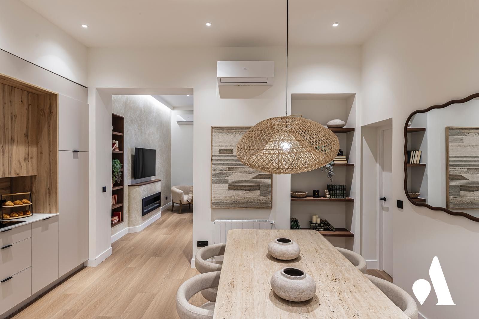 El inmueble cuenta con tres habitaciones y dos baños, proporcionando amplitud para usos familiares y profesionales, con climatización individual y aire acondicionado que aseguran confort en todas las estaciones. El edificio dispone de ascensor y trastero, sumando practicidad a la vida diaria y al almacenamiento. La cocina está diseñada para uso práctico, integrada al comedor y equipada para facilitar el día a día, mientras que la zona de descanso ofrece conectividad y tranquilidad.