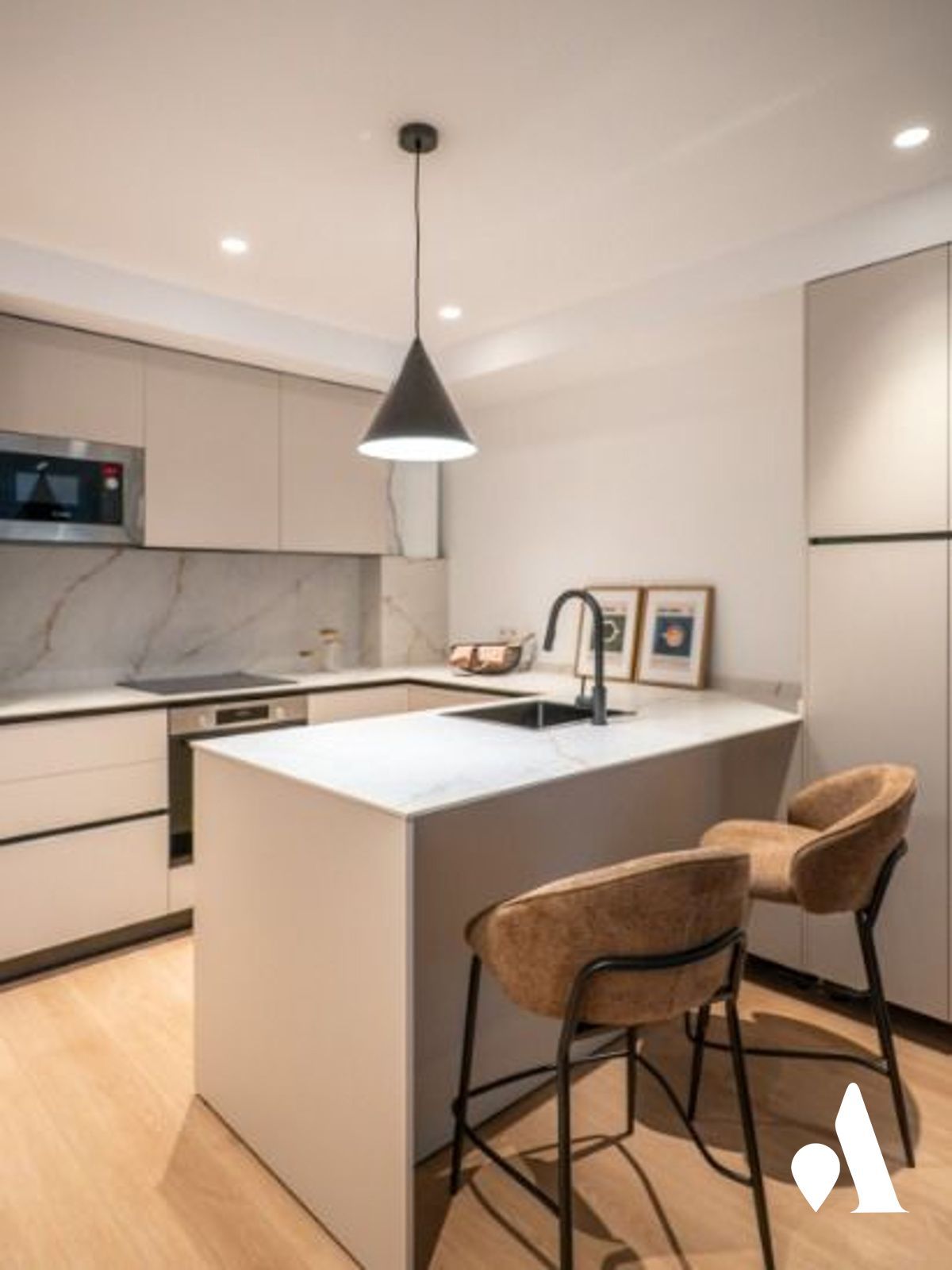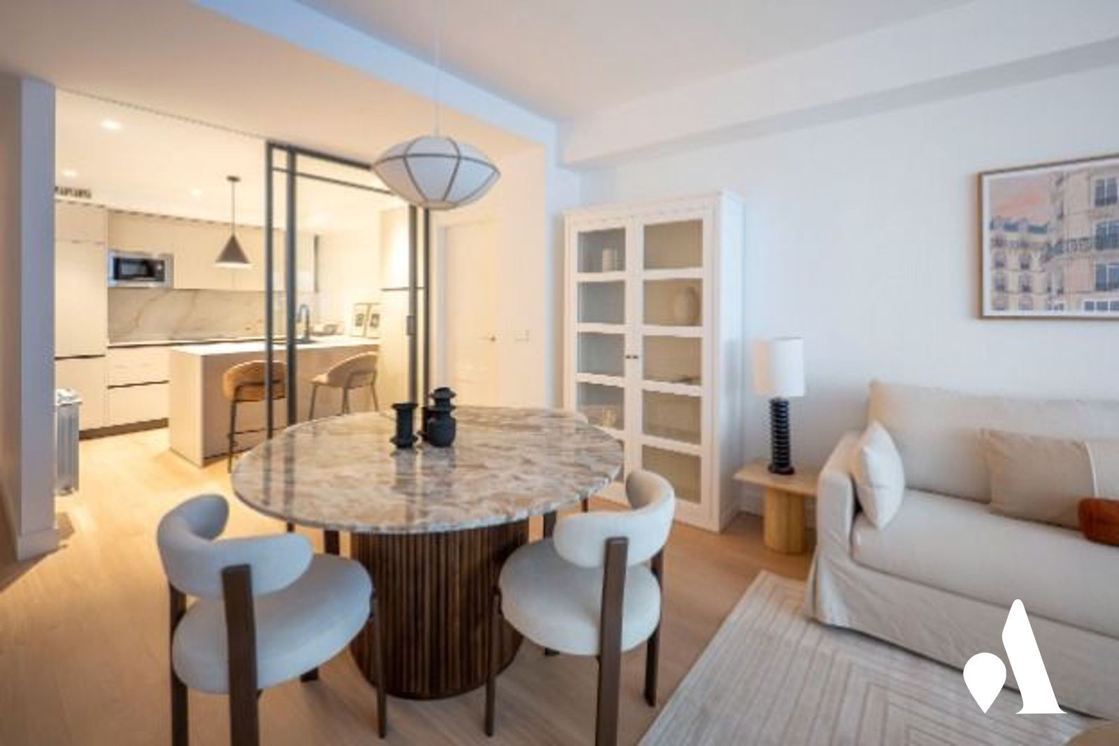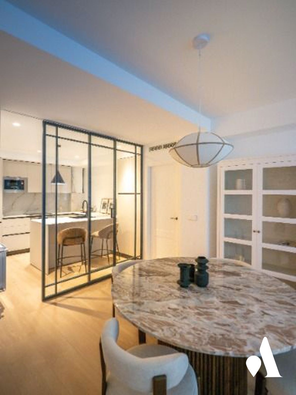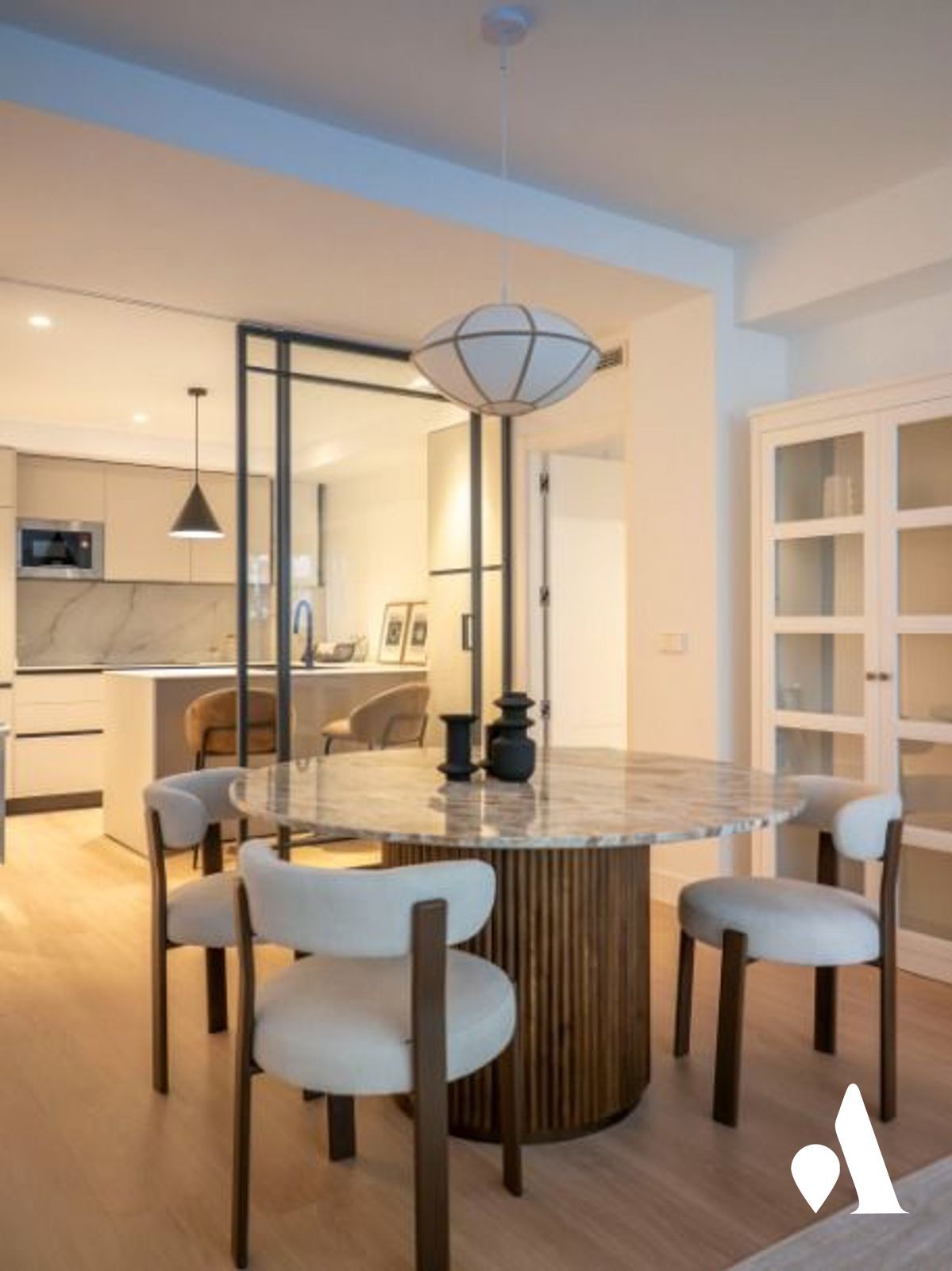 La cocina moderna está conectada al comedor y al salón, creando un espacio abierto y práctico para el día a día y para recibir visitas. Una isla central favorece la interacción y aporta almacenamiento generoso, mientras que la zona social se abre hacia un comedor luminoso y a una zona de estar.