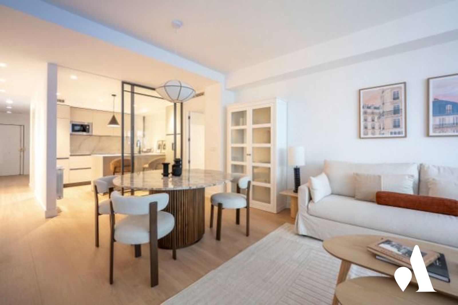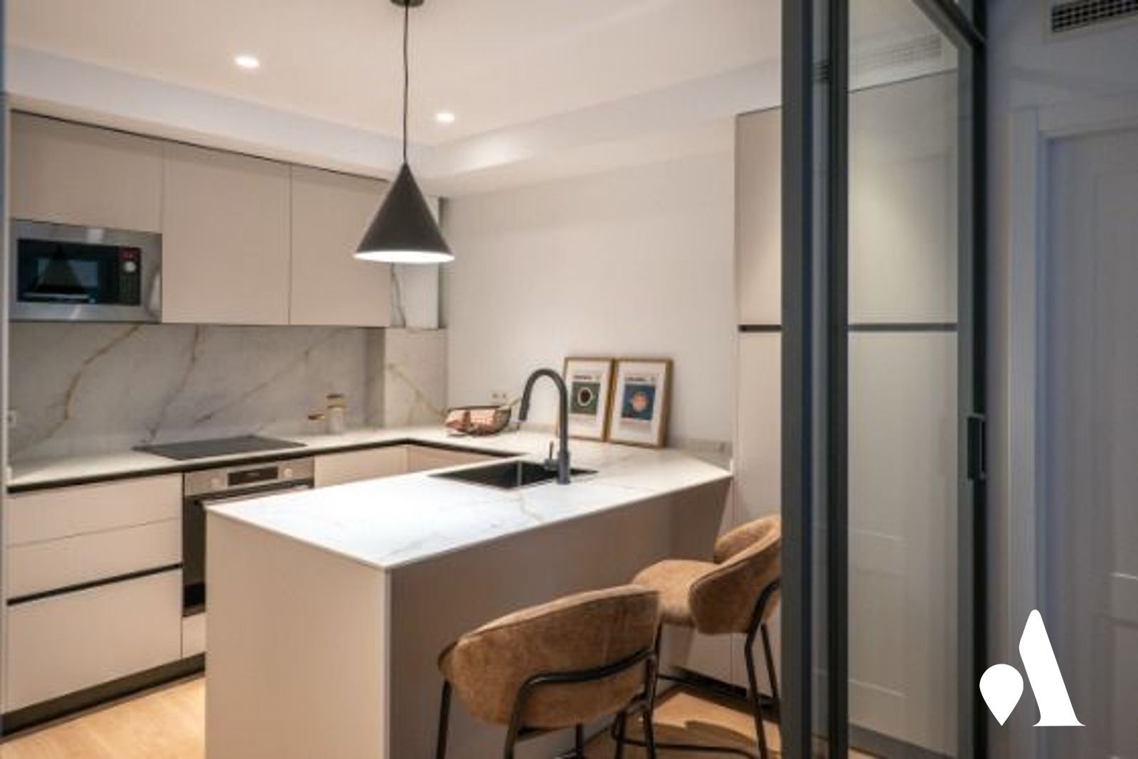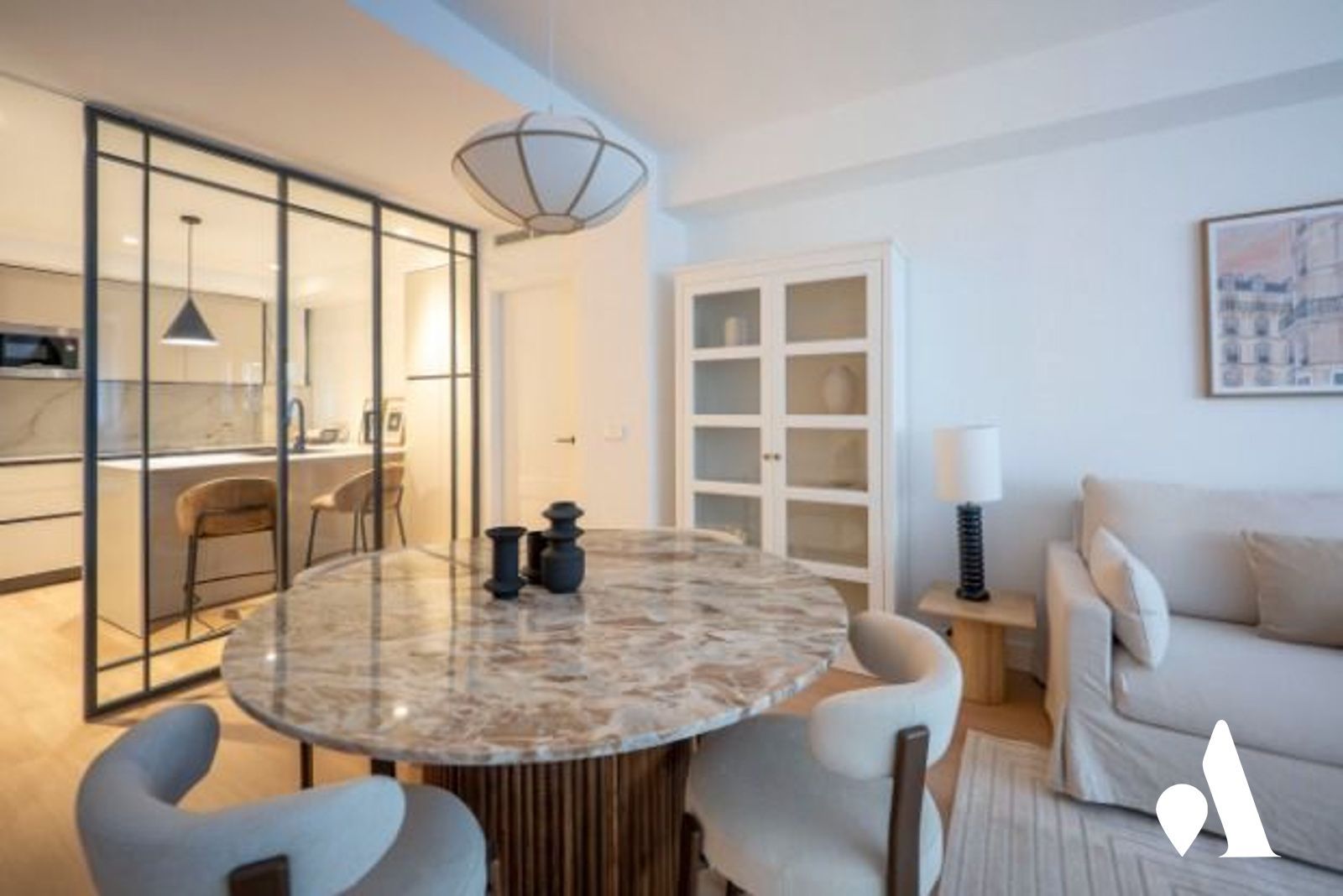 La cocina moderna está conectada al comedor y al salón, creando un espacio abierto y práctico para el día a día y para recibir visitas. Una isla central favorece la interacción y aporta almacenamiento generoso, mientras que la zona social se abre hacia un comedor luminoso y a una zona de estar.