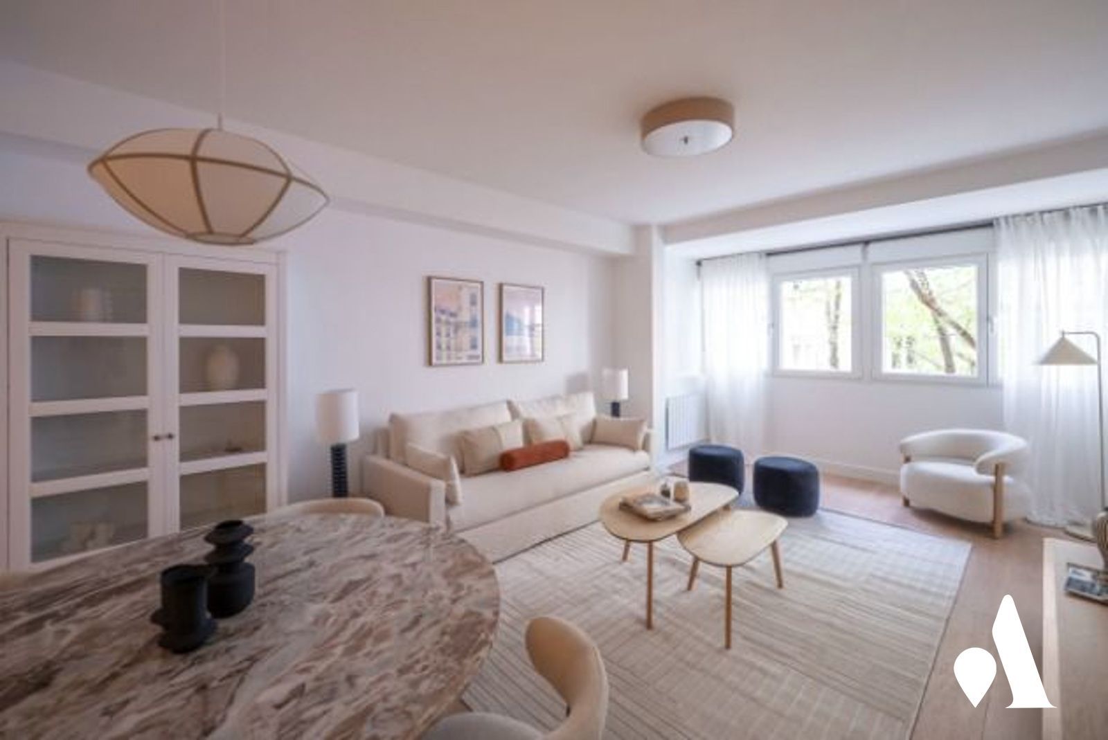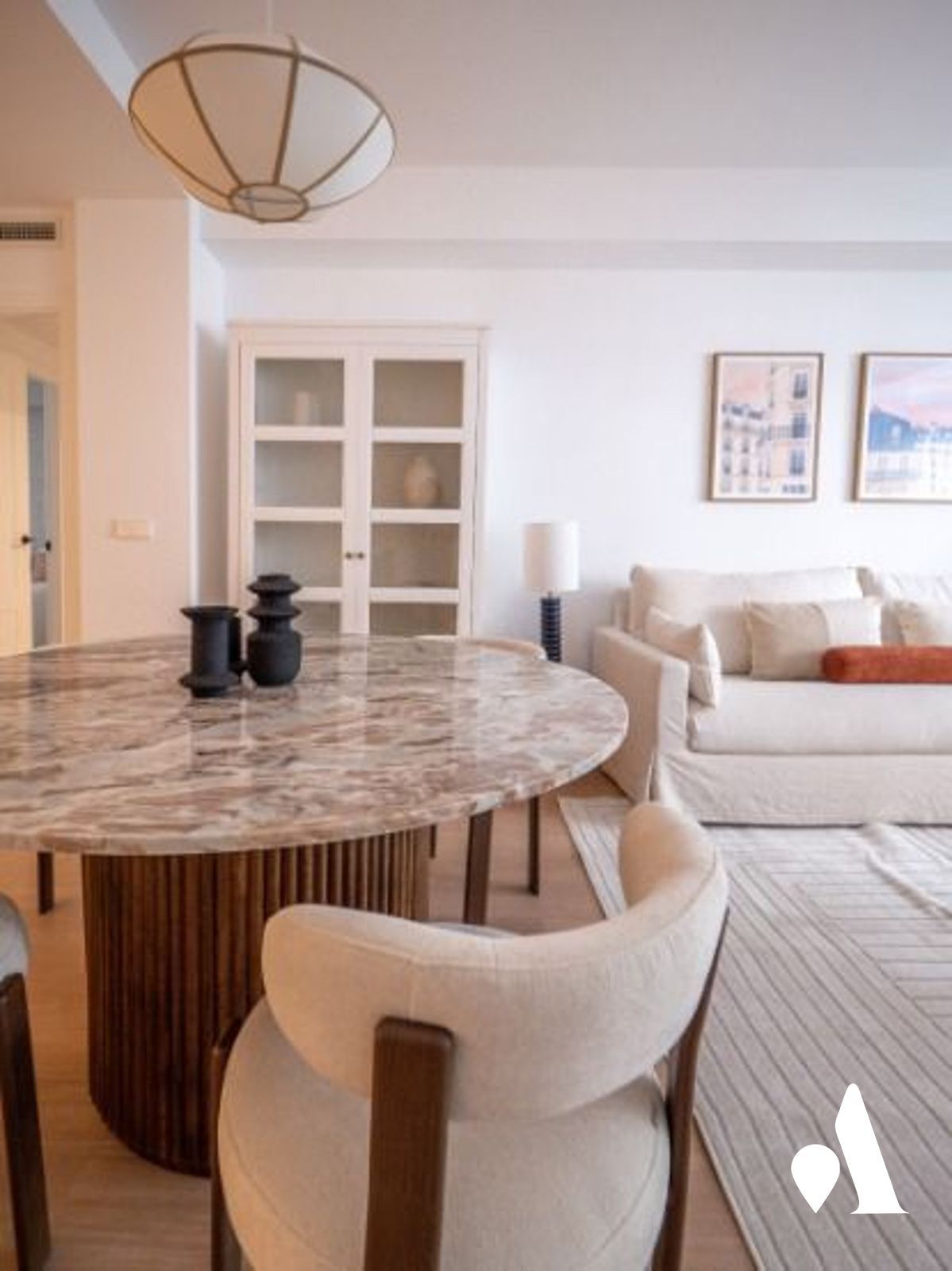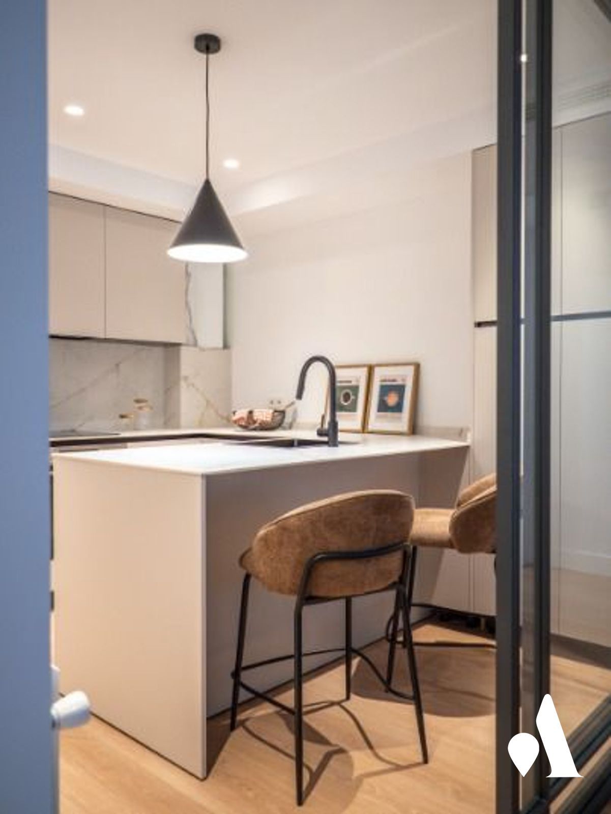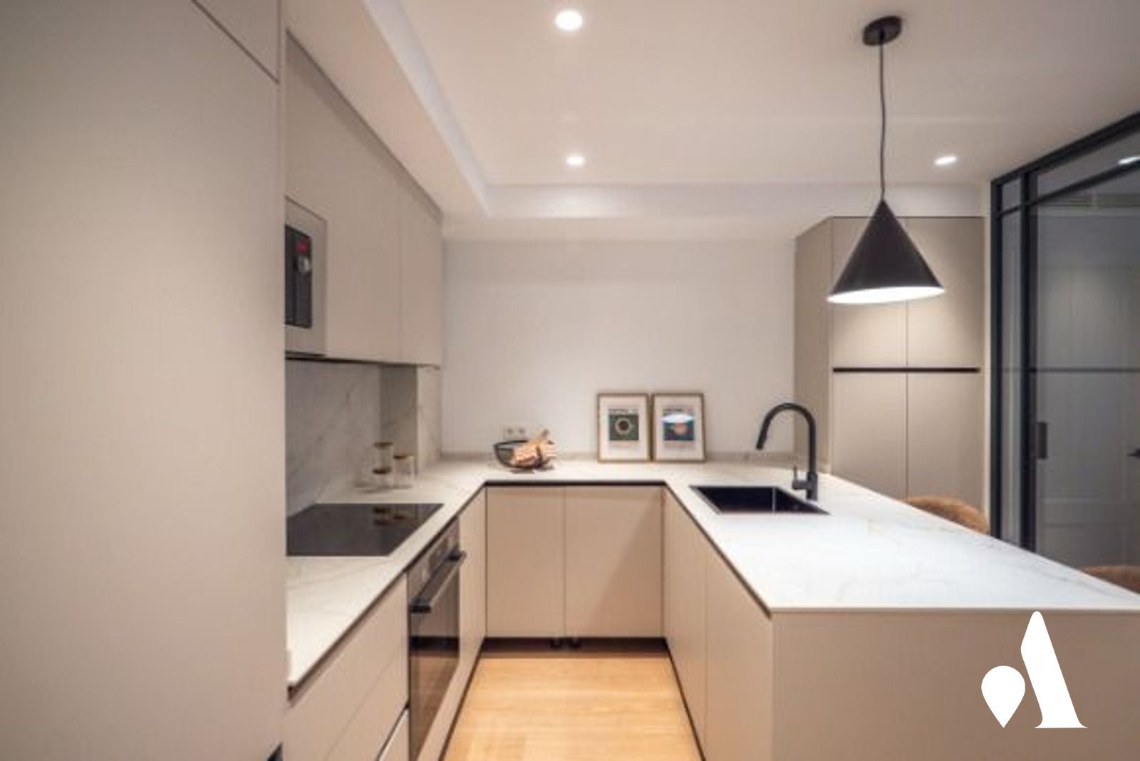 La cocina moderna está conectada al comedor y al salón, creando un espacio abierto y práctico para el día a día y para recibir visitas. Una isla central favorece la interacción y aporta almacenamiento generoso, mientras que la zona social se abre hacia un comedor luminoso y a una zona de estar.